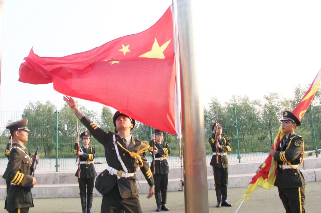 上午7点整,升旗仪式正式开始。学院国旗护卫队成员迈着整齐而坚定的步伐来到了国旗台下。在激昂的国歌声中,鲜艳的五星红旗徐徐升起。全体唱国歌、行注目礼,庄严肃穆。