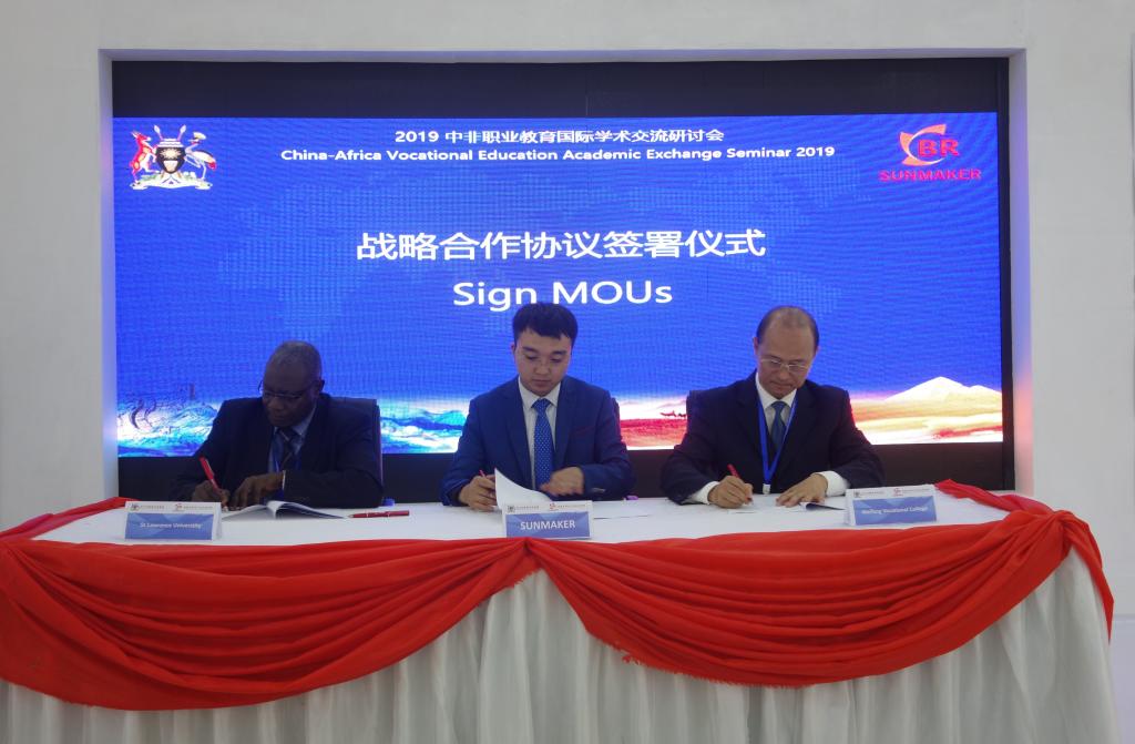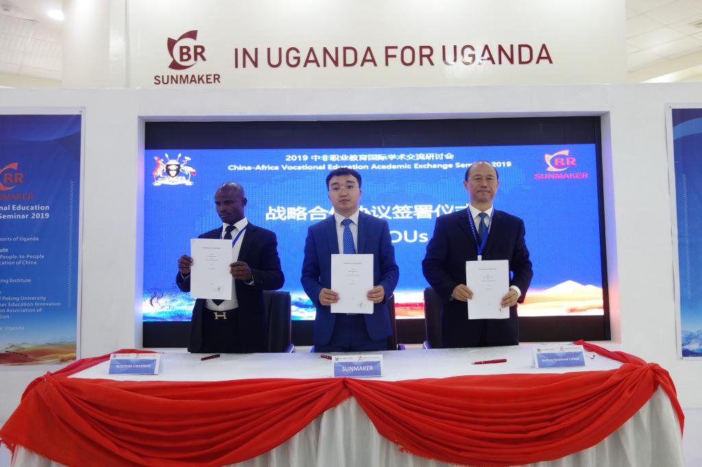 在乌干达,代表团参加了在首都坎帕拉举办的“2019中非职业教育学术交流研讨会”,来自中国、埃塞俄比亚、肯尼亚、坦桑尼亚、乌干达等国家的教育主管部门、职业院校等百余名专家学者与会,讨论中非职业教育合作前景,为中非交流合作搭建平台。马跃启作为中方职业院校代表在研讨会上发言,介绍了中国职业教育概况和MG冰球突破官网的办学实践经验,并签署《坎帕拉倡议》。之后,代表团参加了中非职业院校国际合作交流对接洽谈会和小组专题研讨会,就如何落实“一带一路”和中非合作论坛框架内的教育领域合作,拓宽中非技能培训合作规模展开研讨和项目洽谈,与乌干达贝茨特玛大学、布和巴技术学院和圣劳伦斯大学分别签署合作协议,与圣西门彼得职业培训中心达成合作意向,重点在校际间的师资培训、学生交流、农业技术培训和农机维修等方面开展合作。本次研讨会,乌干达高等教育国务部长穆因戈和中国驻乌干达大使馆政务参赞陈会新分别致辞,乌干达国家电视台、中国职业教育网、人民网、CGTN分别进行跟踪报道。