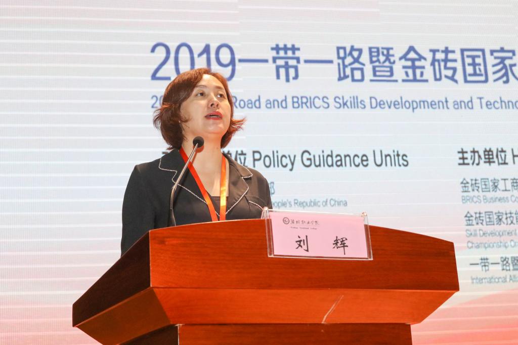 一带一路暨金砖国家技能发展国际联盟副理事长刘辉致闭幕辞并宣布大赛闭幕。她代表一带一路暨金砖国家技能发展国际联盟和金砖大赛组委会对各位获奖选手取得的优异成绩表示祝贺,指出2019一带一路暨金砖国家技能发展与技术创新大赛得到中国政府和海外国家的大力支持,获得优异成绩队伍的中方技能组将统一带队参加俄罗斯赛区的相关竞赛,希望各位晋级选手认真备选,在国际比武中争创佳绩。最后,她向各承办单位、支持企业、各位专家、裁判、指导教师、各位选手为本次大赛所做的工作和努力表示感谢,希望大家一道不忘初心,砥砺前行,共同打造和维护一带一路暨金砖国家技能发展与技术创新国际品牌,真正成为未来金砖国家乃至全球技能发展的奠基石。