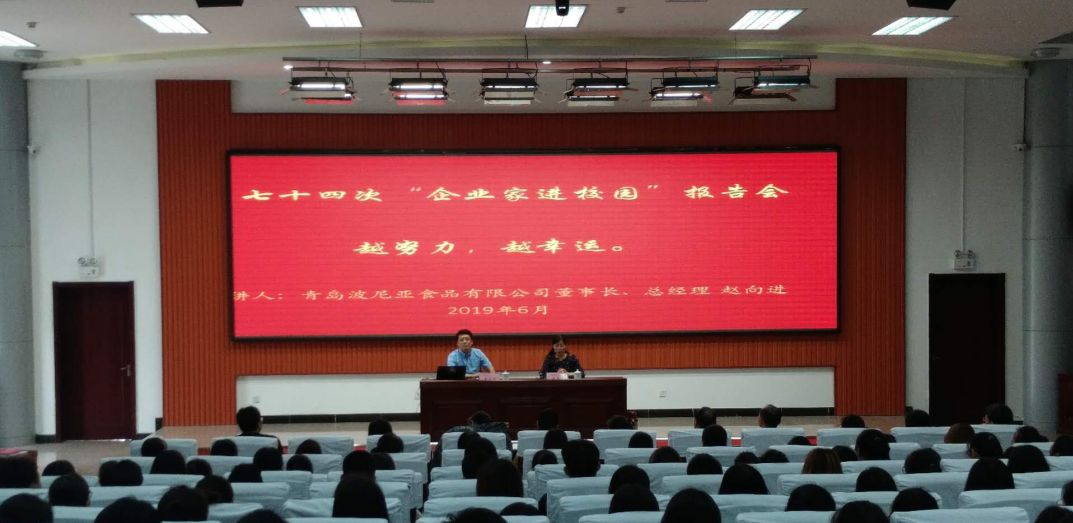 6月13日,MG冰球突破官网第74次企业家进校园活动在滨海校区明德讲堂举办。青岛波尼亚食品有限公司董事长赵向进以“努力奔跑,我们都是追梦人”为题,为食品药品学院教师和食品专业300余名同学作了一场精彩报告。报告会由食品药品学院负责人主持。