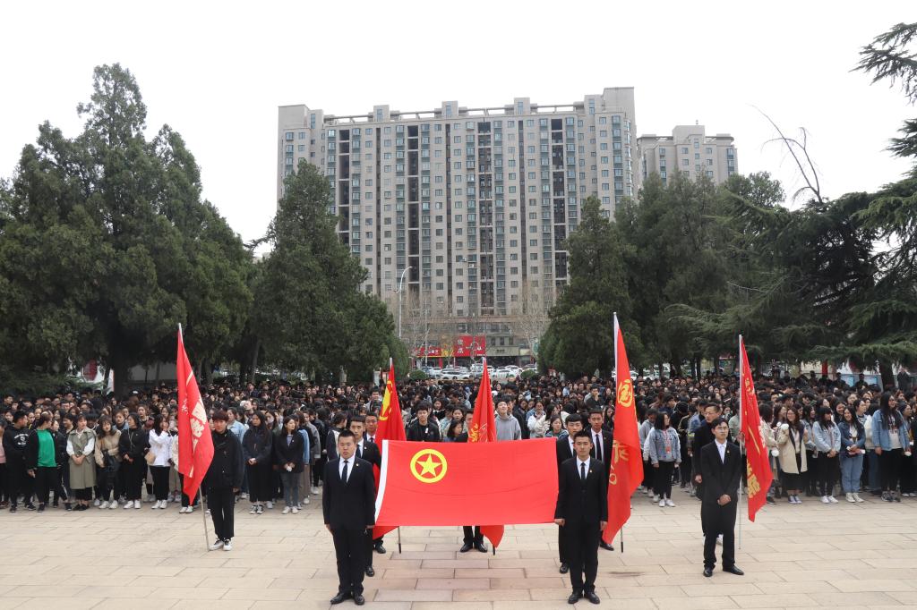 活动庄严肃穆,突出了仪式教育的感召作用。威严耸立的烈士纪念碑前,全体师生高唱国歌、向革命烈士默哀、敬献花圈,重温入团誓词。随后,展开团旗下教育,工作人员向全体师生讲解了从建党初期、抗日战争时期、解放战争以及社会主义建设时期革命烈士的英勇事迹,并号召广大青年学生牢记历史,继承革命先烈敢于争先的优良传统,以习近平新时代中国特色社会主义思想为动力源泉,开拓创新,锐意进取,为实现中国梦不懈奋斗。