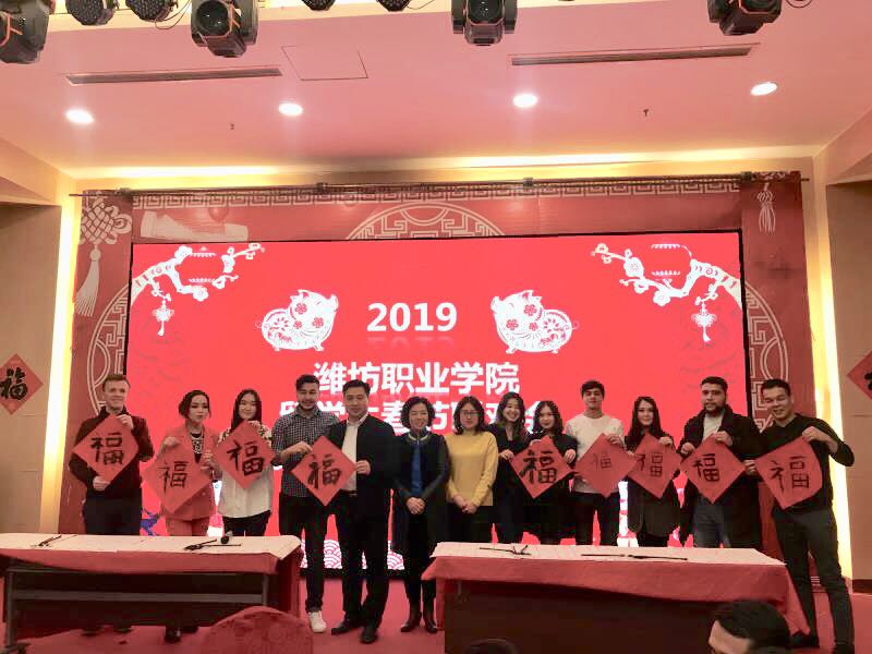 谭明致辞,代表学院向外籍教师及留学生们送上了新春祝福和学院领导的关怀。联欢会现场春联、福字、贴花将活动大厅装扮得极富中国年味。晚会播放了留学生们在潍职学习生活视频集锦,回顾了他们来潍职近半年学习生活的点点滴滴和精彩瞬间。联欢会组织了丰富多彩的歌舞表演、你来比划我来猜汉字比赛、抽奖互动小游戏等,在老师的指导下,同学们用毛笔临摹了寓意吉祥幸福的“福”字贴,大家载歌载舞,品尝具有中国特色的美食--饺子等,全场洋溢着欢乐祥和的节日氛围。活动中学生们争相拍照留念,并将精彩瞬间发给遥远的亲朋好友,传达了他们在中国MG冰球突破官网平安快乐的学习和生活情况。本次活动留学生们亲身体验了中国最重要的节日-春节的文化习俗,成为在华留学难忘的记忆,留学生们对学院周到安排深表谢意。