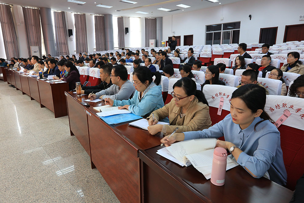 为加快推进学院优质校建设,全面系统安排部署优质校建设工作,迎接优质校中期检查,10月15日上午,学院在滨海校区清泽楼报告厅召开学院优质校建设经验交流会。学院院长王家爱,党委副书记宋桂言,副院长赵君堂、李瑞昌,纪委书记郭晓辉,党委委员、办公室主任谭明出席会议。学院全体中层干部以及各重点建设项目组的骨干成员和优质校建设办公室全体人员参加会议。