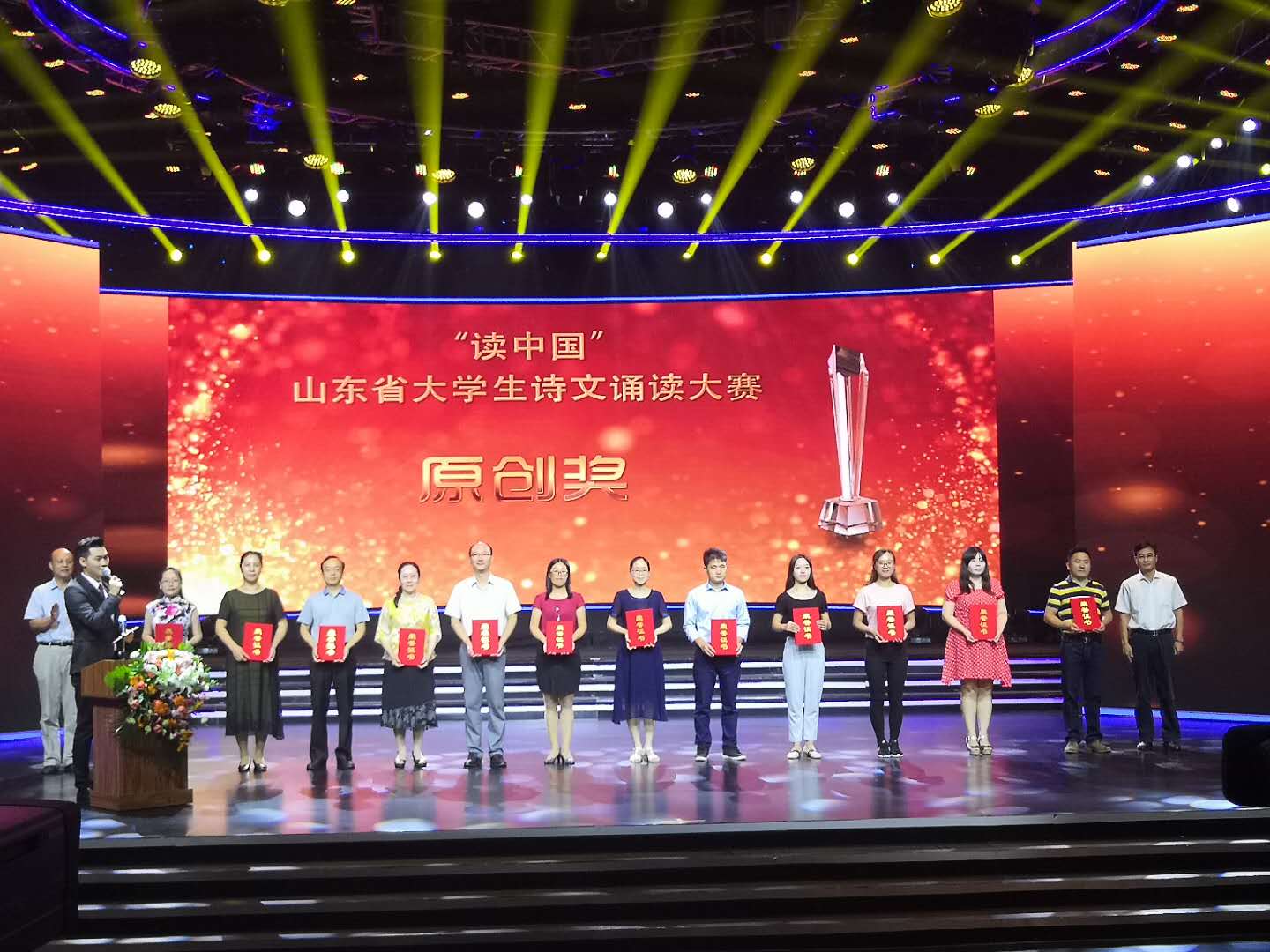 雅言传承文化,经典浸润人生。9月9日,第21届全国推普周山东省启动仪式暨“读中国”山东省大学生诗文诵读大赛颁奖典礼在济南市山东教育电视台举行。MG冰球突破官网推荐的由王静、黄言青、王辉老师指导的《新青年筑梦新时代,新担当助推新动能》、《青春中国》两个作品分获原创高职高专组、朗诵高职高专组二等奖,并作为获奖单位代表受邀参加颁奖典礼。