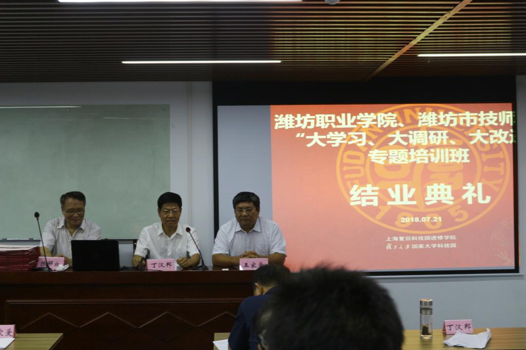 在结业典礼上,陈解放为两个学院的学员代表颁发了结业证书。潍坊市技师学院院长丁汉邦作了总结讲话,他对复旦大学科技进修学院表示了感谢,并对本次培训活动作了高度评价。他指出,本次培训班,开创了潍坊市两个学院联合开展领导干部集训的先河,不仅收获了先进的职教理念和知识,也接受了上海城市文化及复旦大学校园文化的熏陶,更是按受了一次鲜活的党性教育和心灵洗礼,同时,本次培训班,进一步加深了MG冰球突破官网和潍坊市技师学院的友谊,为今后两个学院的深度合作和建设发展奠定了良好基础。(邢同胜供稿)