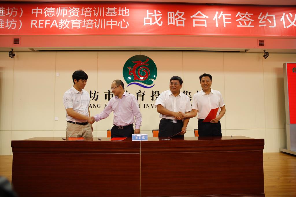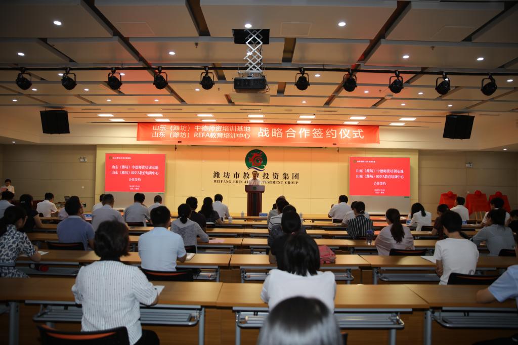 7月4日,山东(潍坊)中德师资培训基地、山东(潍坊)REFA教育培训中心揭牌仪式在山东(潍坊)公共实训基地举行。学院党委书记张洪全,党委副书记、院长王家爱,党委委员、副院长赵君堂,党委委员、办公室主任谭明,德国企业管理协会(REFA)大中华区代表沃夫冈·瓦格纳博士,潍坊市教育投资集团有限公司董事长秦春雨, 潍坊市教育投资集团有限公司党委委员、常务副总经理许京波,潍坊市国有资产运营管理中心副主任单海全、潍坊市机械电子行业办公室副主任白宗家、滨海区经济运行和科技商务局副局长孙军海,北京无限智联科技有限公司董事长吴垠等相关领导和嘉宾参加成立仪式。