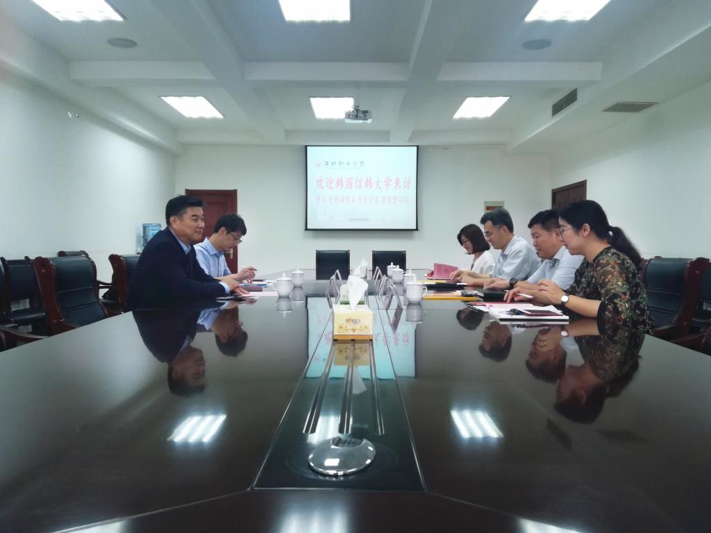 6月27日上午,韩国信韩大学国际交流处处长李敏善一行2人到MG冰球突破官网访问,学院副院长赵君堂在奎文校区接待了客人,国际交流与合作处、化学工程学院和现代服务业学院的相关负责同志参加了座谈交流。