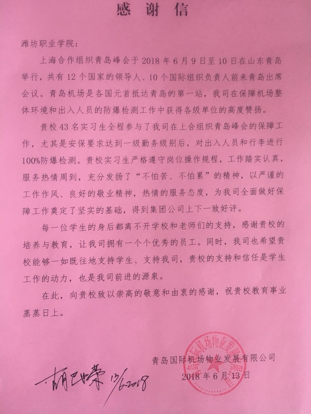 经过前期两周的适应期,学生们在6月份青岛上合峰会召开期间,在工作岗位上以标准的动作、得体的举止、规范的语言等服务于每一位通过青岛机场的中外旅客,她们的出色表现为青岛上合峰会亮出了防爆安检的新名片,得到了机场领导和过往旅客的交口称赞,树立了机场安检的良好形象,也为MG冰球突破官网赢得了良好的社会口碑。(梁延安 李桂杰供稿)