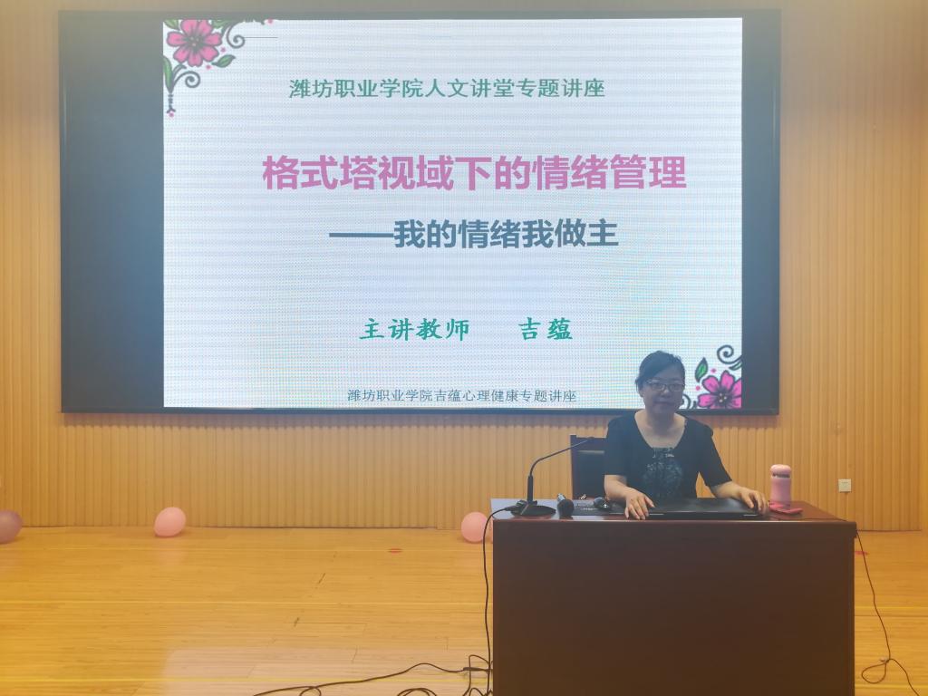 6月7日,学院第二十一场人文素养讲座在奎文校区创业中心报告厅举办,通识教育中心副教授、国家二级心理咨询师吉蕴作了题为“格式塔视域下的情绪管理----我的情绪我做主”的讲座,奎文200名学生参加讲座。