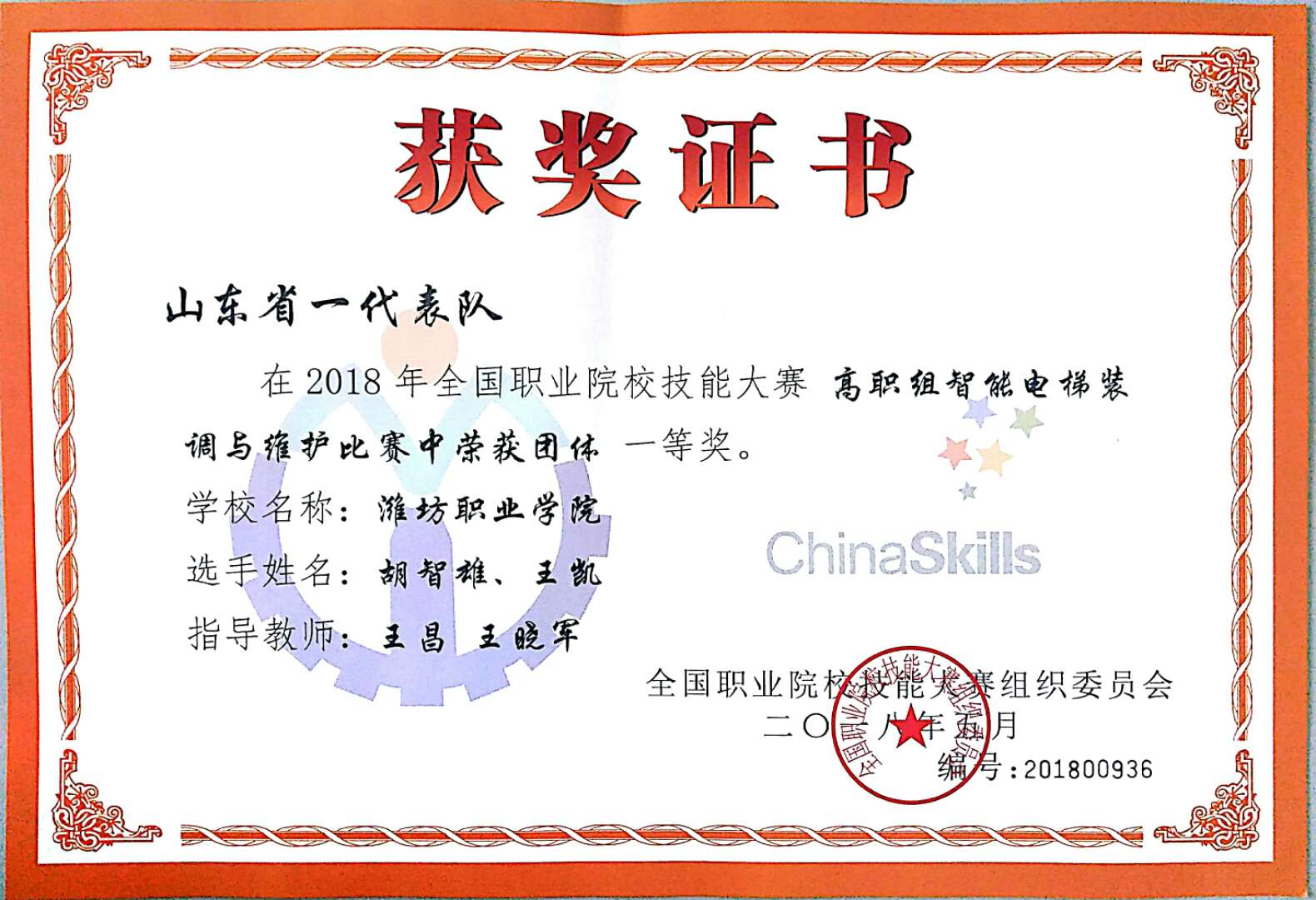 5月6日至8日,2018年全国职业院校技能大赛高职组“智能电梯装调与维护”赛项在天津轻工职业技术学院举行。来自全国的81支代表队参赛。MG冰球突破官网机电工程学院选派学生王凯、胡智雄,指导教师程义民、王昌、王晓军组成的山东一队参加了比赛,获得团体一等奖第一名,MG冰球突破官网连续四届均获得该赛项国赛一等奖。