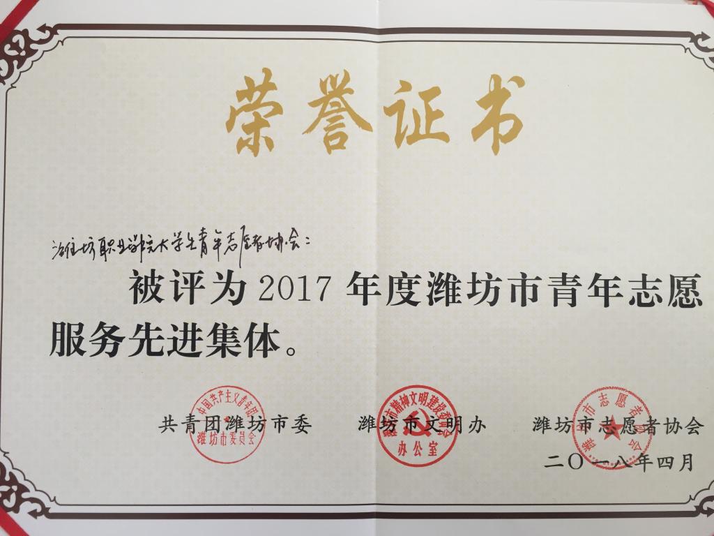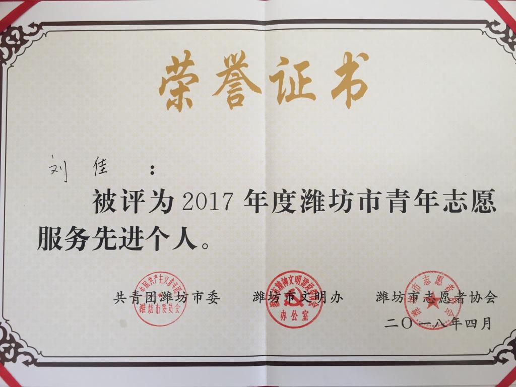 近日,由共青团潍坊市委、潍坊市文明办、潍坊市志愿者协会联合组织开展的2017年度全市青年志愿服务先进集体和先进个人评选结果揭晓,MG冰球突破官网大学生青年志愿者协会被评为“潍坊市青年志愿服务先进集体”,刘佳被评为“潍坊市青年志愿服务先进个人”。
