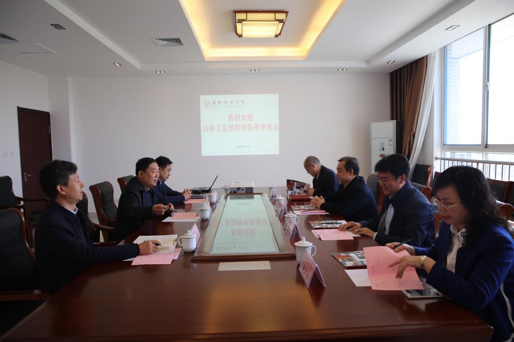 4月11日,山东工业技师学院党委副书记孙义宝一行5人来MG冰球突破官网考察交流。党委副书记宋桂言会见了客人。党委委员、办公室主任谭明,组织人事处负责同志参加座谈。