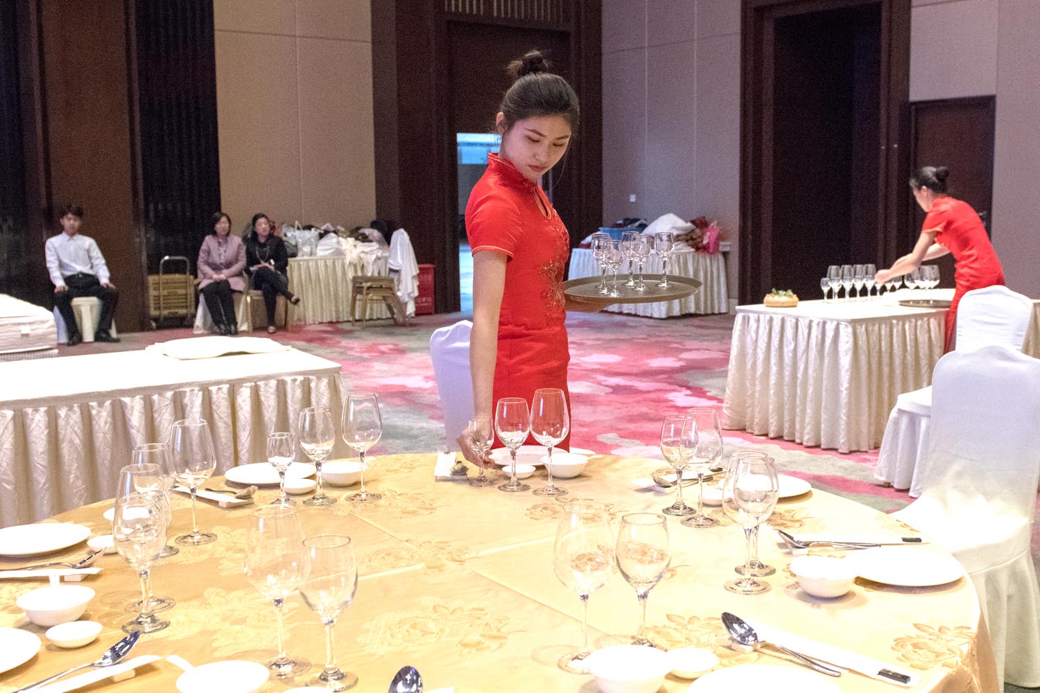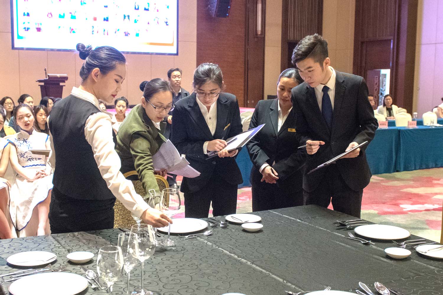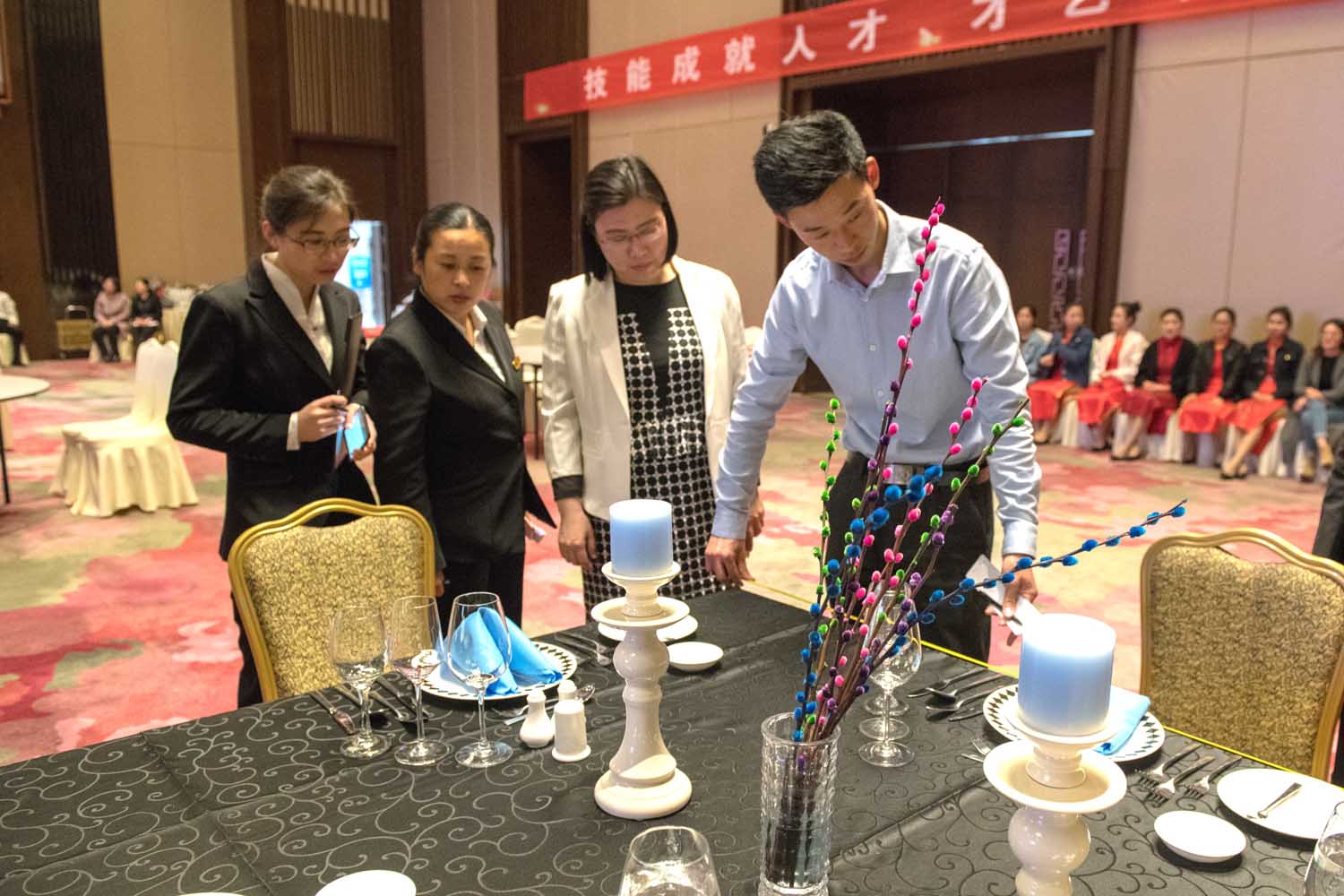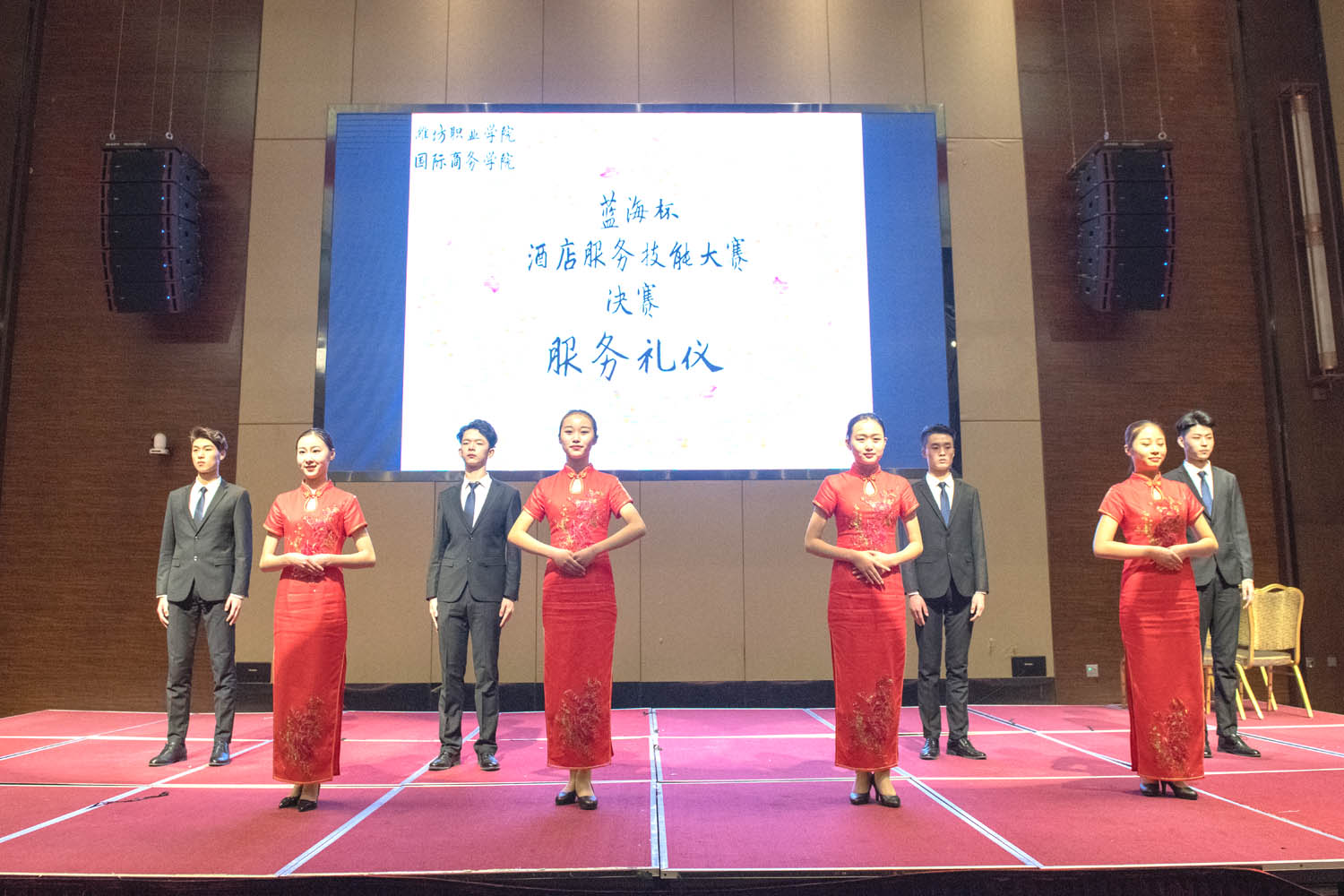 本次大赛从年初开始筹备,分为校内初赛、复赛和校外决赛三个阶段,经过初复赛遴选出42名选手晋级决赛,包括西餐宴会摆台比试、中餐宴会摆台比试、中式铺床比试、服务礼仪比试等四个赛项以及才艺展示。决赛最吸睛的部分是聘请了蓝海大酒店餐饮部、客房部4名主管担任决赛评委,要求参赛选手根据设计方案,在规定时间内现场展示中餐宴会摆台、西餐宴会摆台、中式铺床服务和服务礼仪比试。比赛过程中,参赛选手分工明确,密切配合,沉着比赛,凭借熟练的操作和娴熟的技术,赛出风格、赛出水平、赛出风采,赢得了蓝海酒店评委和与会人员的一致好评。