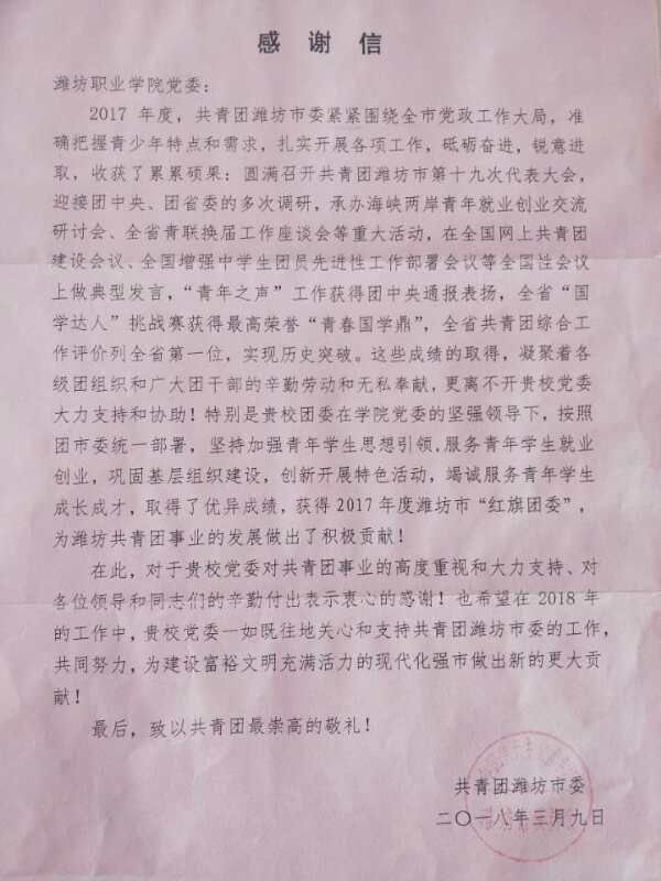 3月9日,共青团潍坊市委十九届二次全委(扩大)会议表彰了2017年度全市共青团工作中涌现出的优秀单位和先进典型。MG冰球突破官网团委被评为2017年度潍坊市“红旗团委”,刘志艳同志荣获2017年度“潍坊市优秀青年工作者”称号,隋鹏同志荣获2017年度全市共青团系统宣传信息工作“先进个人”称号。