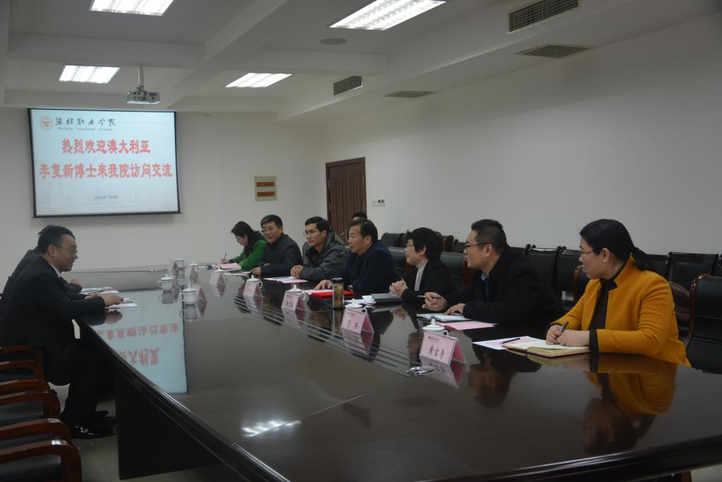 1月4日下午,澳大利亚华裔教育专家、中文教师联合会主席李复新博士一行两人莅临MG冰球突破官网进行友好访问。副院长贺志强会见了客人,奎文校区管理办公室、科技处及国际商务学院相关负责同志参加了座谈。