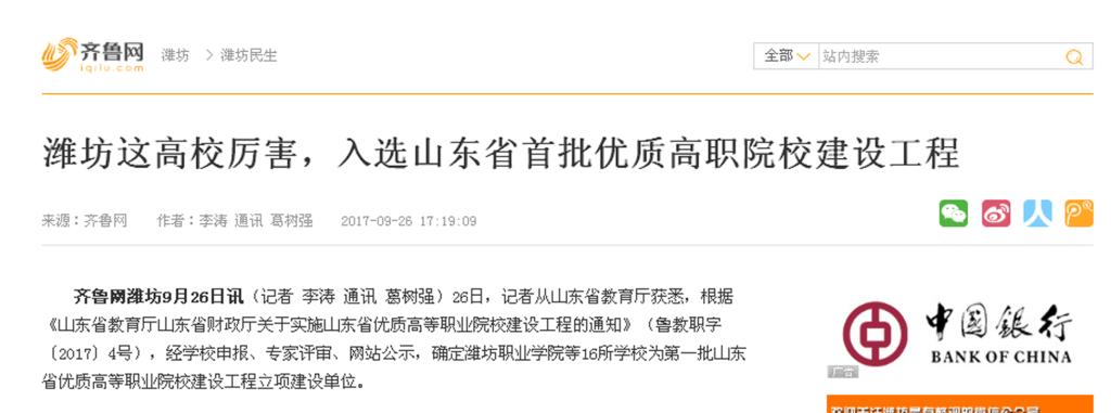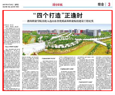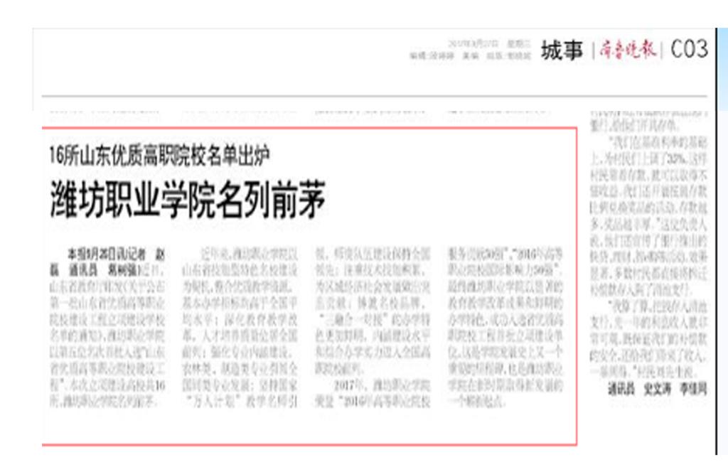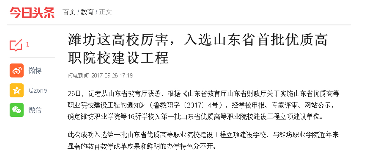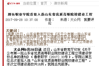 近日,山东省教育厅公布第一批山东省优质高等职业院校立项建设工程,MG冰球突破官网以第五位名次首批入选“山东省优质高等职业院校建设工程”,潍坊日报、潍坊电视台、齐鲁晚报、今日头条、齐鲁网、大众网、潍坊传媒网、潍坊新闻网、滨海日报等多家媒体作了多角度宣传报道,彰显了学院显著的教育教学改革成果和鲜明的办学特色,向全省全国展示了MG冰球突破官网职业教育发展新成就。