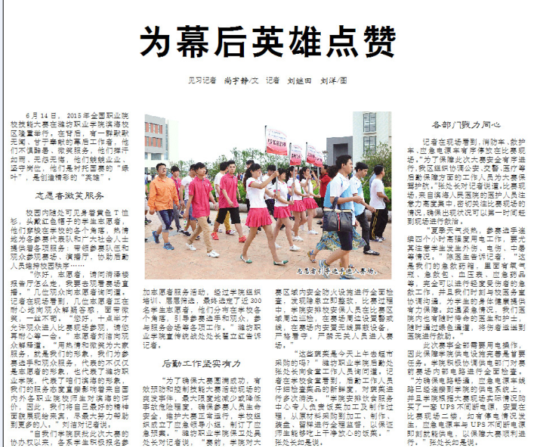 6月14日,2015年全国职业院校技能大赛在MG冰球突破官网滨海校区隆重举行,在此期间,我们看到了比赛现场、赛事直播间一幅幅精彩、激烈的画面。在这精彩的背后有着一群默默无闻,甘于奉献的幕后工作者,他们不惧酷暑,微笑服务,他们挥汗如雨,无怨无悔,他们兢兢业业,坚守在各自岗位,他们是衬托国赛的“绿叶”,是创造精彩的英雄,是最可爱的人!