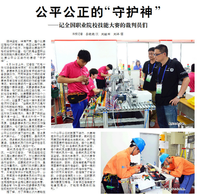 6月14日上午,记者在“机电一体化设备组装与调试”的比赛现场看到,参赛学员正在紧张有序地进行设备安装工作,而同样紧张忙碌的还有比赛的裁判员们,他们有的站在原地查看有没有参赛学员出现违规动作或者作弊情况;有的在赛场内一直巡走观察,把握整个赛事进度。只要一有参赛学员举手报告,他们就第一时间赶过去处理,一刻也没有停歇。比赛需要进行四个小时,裁判员们也需要坚守工作岗位四个小时。巡查累了坐在一旁休息的谢老师对记者说:“当裁判员不仅是对眼力和技能的考验,也是对体力的考验,一场比赛下来需要站四个小时,这对体力消耗很大,偶尔累了我就坐着休息一会儿,喝点水补充一下体力,然后再继续监考。虽然感觉身心很累,但是参赛学员们比我的工作强度还要大,他们参加比赛更加需要一个好的环境,只要能保证他们在一个公平公正的环境下进行比赛,苦点累点不算什么。”记者看到,虽然天气炎热,很多裁判员的衣服已经被汗水浸透,但是裁判员们依然坚守在工作岗位上,没有人抱怨一句。