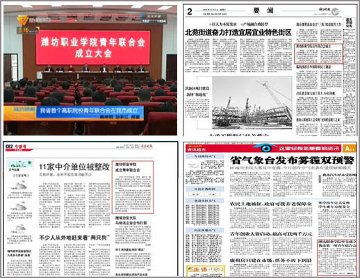 10月31日,学院召开青年联合会成立大会。潍坊日报、潍坊晚报、齐鲁晚报、滨海日报等媒体作了报道,潍坊电视台新闻综合频道以《我省首个高职院校青年联合在我市成立》为题作了报道。