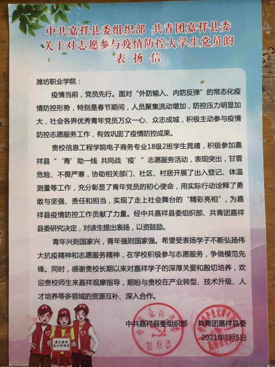近日,信息工程学院团总支收到中共嘉祥县委组织部、共青团嘉祥县委送来的一封感谢信,感谢MG冰球突破官网2018级电子商务2班晁晴同学在春节期间积极主动参加疫情防控志愿服务工作。一封感谢信,不仅是潍职学子在用实际行动诠释勇敢与坚强、责任与担当,更是“崇实尚行 敢于争先”潍职精神的体现。