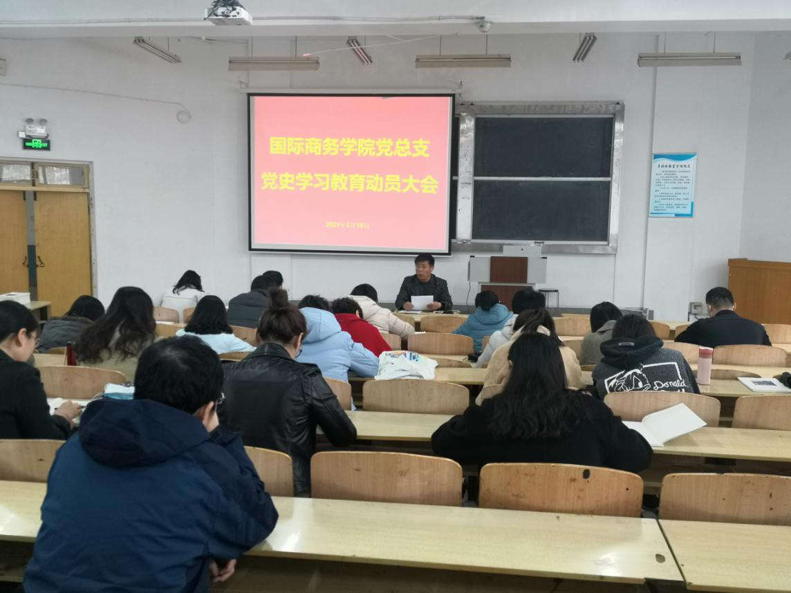 为切实贯彻落实全省教育系统、学校党史学习教育动员大会精神,营造“学党史、悟思想、办实事、开新局”的干事创业氛围,3月18日下午,国际商务学院党总支在9号楼101室召开党史学习教育动员大会。该院党总支副书记主持会议,全体党员参会。