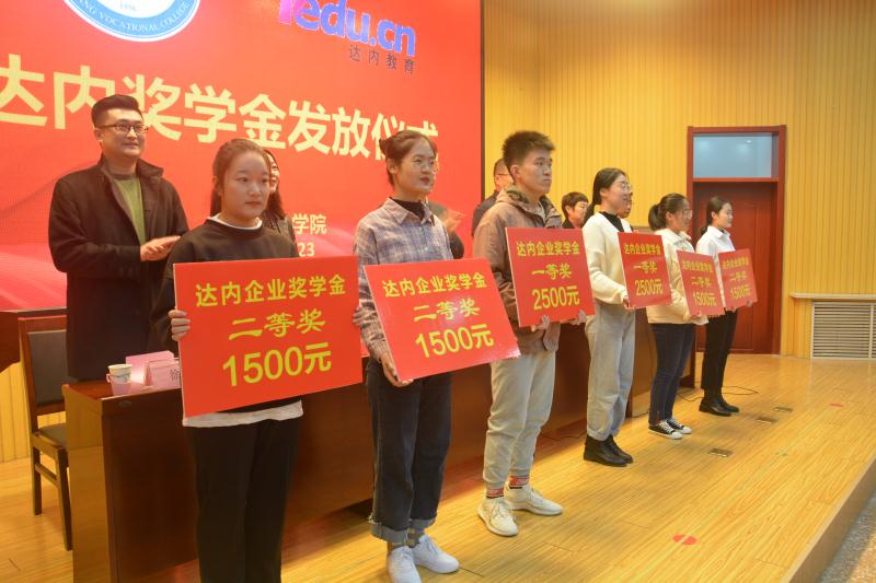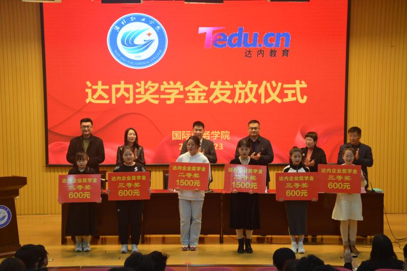 国际商务学院负责同志代表学院致辞,对达内集团提供企业奖学金表示感谢,对校企合作两年来所取得的成效进行了回顾和总结,对获得奖学金的18名优秀同学们表示衷心祝贺,并以此激励所有同学,刻苦学习,努力提升,将来成为一名符合企业岗位需求的优秀毕业生,一名可持续发展的人,一名全面发展的人。并表达了对校企双方强强联合、优势互补,续写更加辉煌的篇章的祝福和期待。杨泽辉代表企业方致辞,通过借用王国维先生《人间词话》古今之成大事业、大学问者,必经过三种之境界,来勉励同学们在学习上要不畏困苦,持之以恒。徐勇宣读获奖学生名单,在场领导为获得企业奖学金的18名同学颁奖。最后,吴慧青为商务管理(人力资源管理方向)共建专业的同学们讲授了基于胜任素质模型的成果导向人才培养方案,为专业共建学生在校学习及未来就业描绘了蓝图。