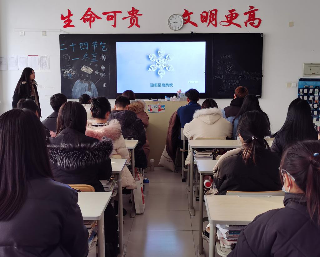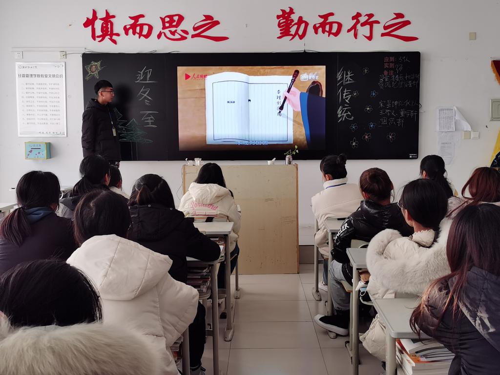 主题团课在一首《二十四节气之冬至歌》中拉开序幕,各班团支书通过视频、PPT及图片文字等多种形式带领同学们一起回顾了中国的二十四节气和传统节日。同学们通过主题团课系统学习了“冬至”的节气文化,了解到冬至的气候特征、气候知识、节日的由来,学习了相关的谚语与诗词,对这个传统节日有了更加深刻的认识。最后,主题团课在传统文化知识竞赛中落下帷幕,同学们认真思考,踊跃参与,现场气氛活跃。