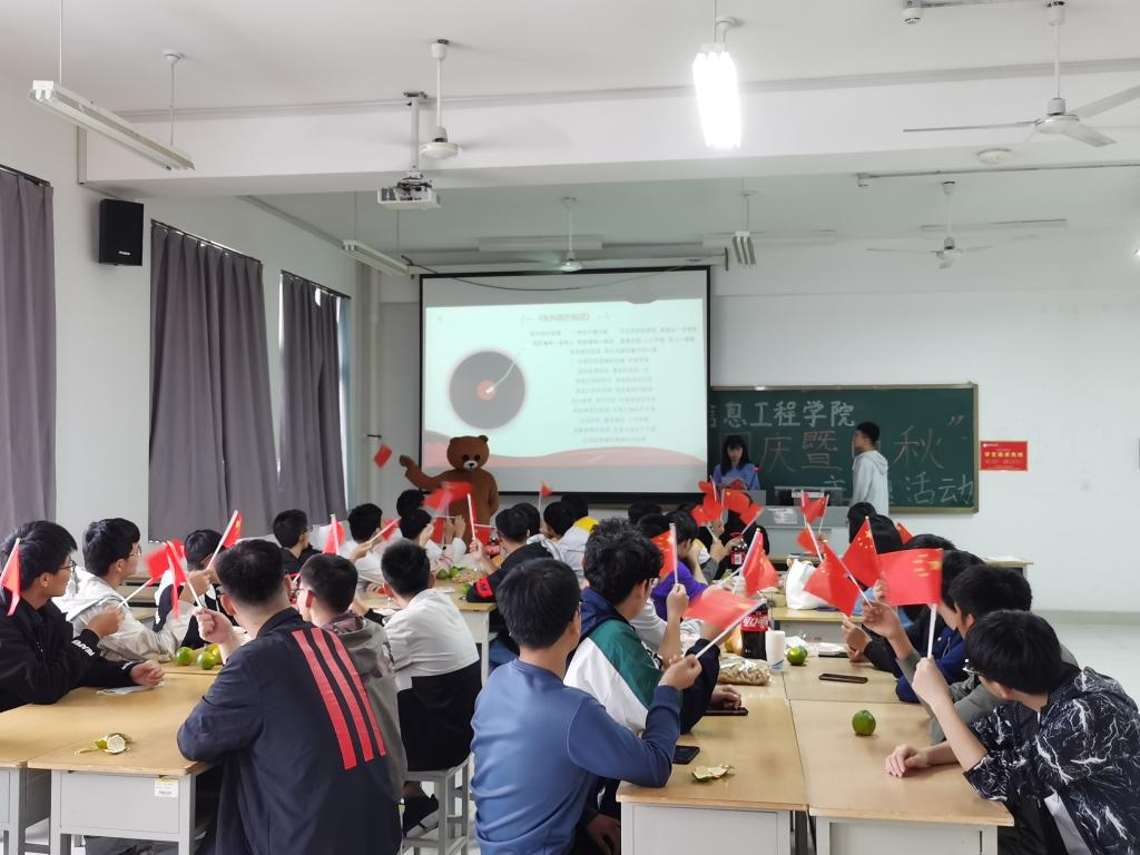 10月1日下午,信息工程学院开展了以“迎国庆、庆中秋”为主题的联欢活动,给因疫情防控、路途遥远以及大赛训练等各种原因无法回家团聚的同学们送去了温暖与祝福,信息工程学院团总支负责老师、值班老师以及各班级留校学生60余人参加了此次活动。