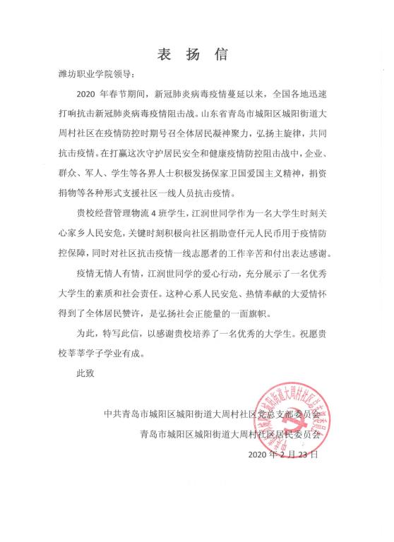 3月11日MG冰球突破官网收到来自中共青岛市城阳区城阳街道大周村社区一封特殊的表扬信,2019级物流管理四班江润世同学向社区疫情防控无偿捐款壹千元人民币。他捐款的数目虽不巨大,却承载了爱的力量。在同学们眼中,他是善于助人的好朋友,当同学们有困难的时候,他总会会尽自己所能的帮助。