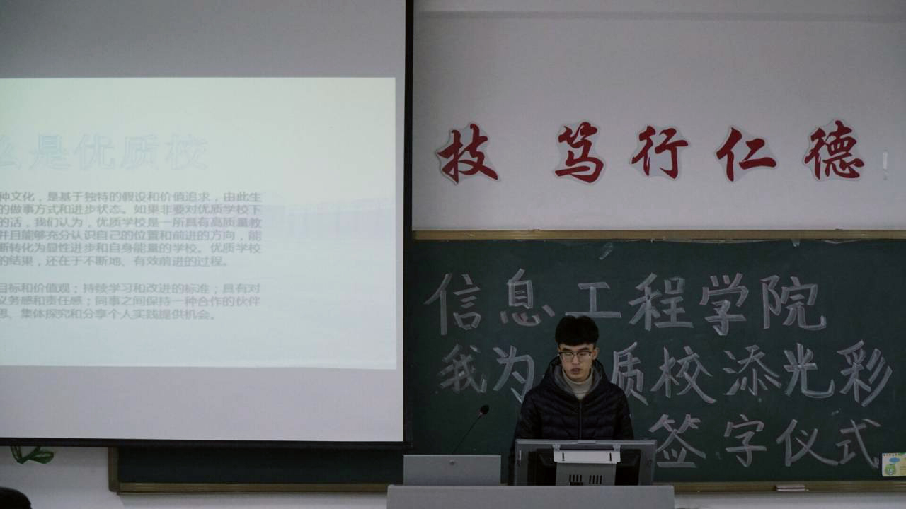 本次主题团日活动面向信息工程学院全体学生,包括签名活动、演讲比赛及主题团课三个部分构成。在签名活动中,各班级学生干部统一进行学习,深入贯彻潍职校训、潍职文化理念以及建设优质校的目标及内容,集体起立宣读维职校训及维职精神,并在横幅上写下名字,承诺以饱满的精神为MG冰球突破官网优质校和文明校园建设起到带头作用;在演讲比赛中,选手们以蓬勃的精神风貌,生动的语言,畅谈了对学院优质校建设的理解,号召同学们积极参与学院优质校建设,与学院共成长;在晚上各班级组织的主题团课上,各班级学生干部通过PPT详细介绍了MG冰球突破官网优质高职院校建设情况,指出学生在优质校建设活动中的作用,激发青年学生投身优质校建设的积极性和责任感,同学们也结合自己的实际,纷纷表态发言,表达了自己对优质校建设的理解和感悟,表示要以实际行动,助力学院优质高职院校建设,活动最后,通过微信公众号召全体同学构筑同心圆,珍惜校园时光,力争有所作为,有所成就,为学院优质校和文明校园的建设贡献自己的一份力量。