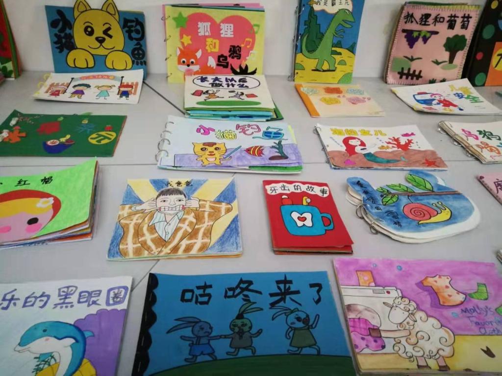 心灵手巧的同学们用一颗童心来感悟生活,巧妙构思,精心绘画,指尖下一幅幅精彩的画面演绎着丰富多彩的故事,在绘阅的过程中培养真、善、美的情感。在两周的时间内,同学们就制作完成了200余本图画书。这些图画书内容多样,所用材质、装帧风格各异。有根据经典童话编绘的《丑小鸭》《海的女儿》、寓言故事《龟兔赛跑》、《狐狸和葡萄》、现代儿童故事《我爸爸超厉害》《月亮的味道》等,还有在绘本基础上学生自己创新的《懂礼貌的兔子》《长大以后做什么》《鸡蛋哥哥》《让世界充满爱》《云朵面包》《魔法靴》等以及原创的树叶书、动物世界儿歌集等,还有可动手拼插的认知功能书;有画的,有粘贴的,有缝制的……学生们用巧手绘制出一个图画书的王国,创意无限,精彩纷呈。