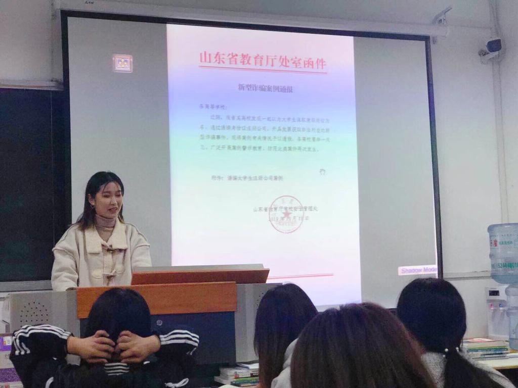 同时,组织144名学生参加由靖霖(北京)律师事务所专职律师邢环环作的“远离校园贷,青春不负债”主题教育报告会。报告会向学生普及了校园网贷和电信诈骗的预防知识,增强了学生的金融防范意识,提高了学生的预防电信诈骗能力。