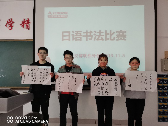 为了激发学生们的日语学习兴趣,提高日语学习积极性,丰富学生们的校园文化生活,11月5日下午,信息工程学院企业兼职教师带领2018级软件外包学生进行了一场趣味十足的日语书法比赛。