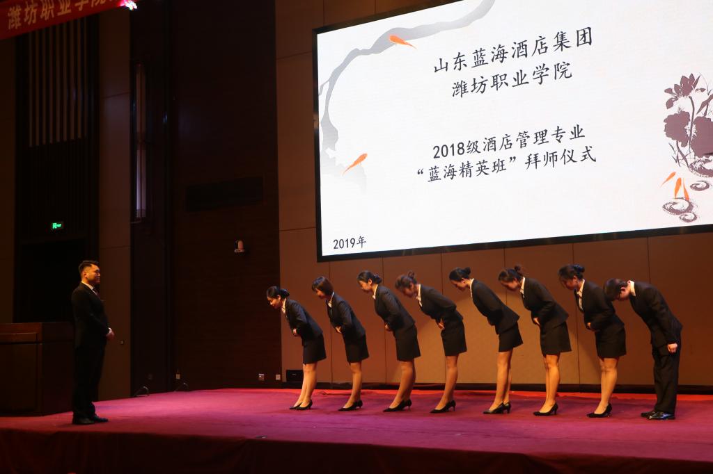 仪式的第二项内容是首批“蓝海精英班”的同学进行隆重的拜师仪式,杨兆永、辛国庆为仪式致辞,给了同学们极大的鼓舞。仪式分为人力资源管理部、房务部、渔歌舫部、会务部、钟鼎楼部、自助餐部六组,每组学生依次上台拜师,学生向师傅鞠躬,师傅为学生赠送礼物。之后,师傅代表范守峰上台发言,表达了对学生的厚爱与期许。学生代表上台发言,表达了对师傅的感谢和对未来职业生涯的憧憬。