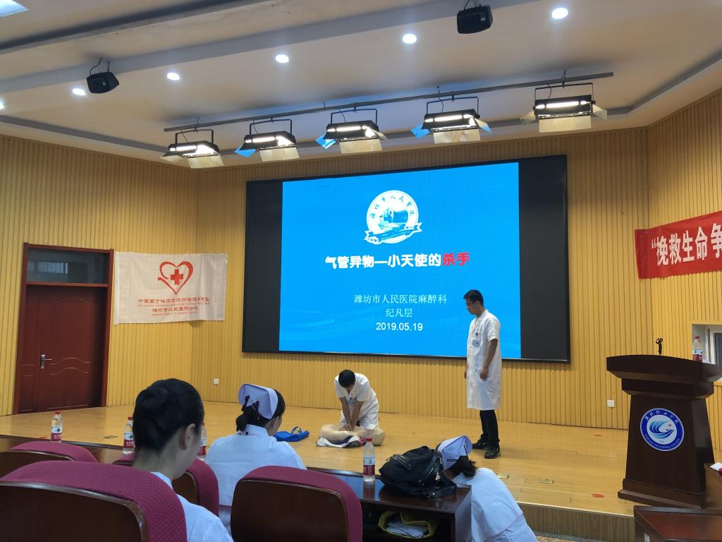近日,现代服务业学院邀请潍坊市人民医院麻醉科主任仪福霞及多位身处一线的医护人员为师生作心肺复苏知识讲座和现场演练。2018级空乘专业学生及教师代表参加了本次活动。