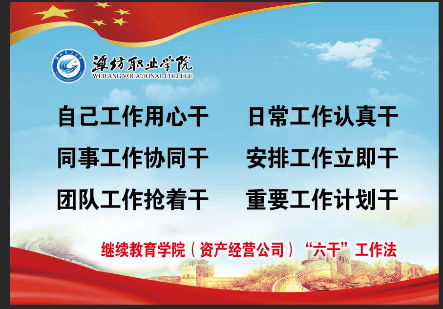 为使“六干”工作法内化于心、外化于形,继续教育学院将“六干”工作法内容“上桌上墙”,推动“六干”工作法成为共识,营造全员担当作为、狠抓落实的浓厚氛围。下一步,继续教育学院将持续深化“六干”工作法,坚持党建与业务“一体融合”,推动职业农民学院、驾校、学历继续教育、社会培训和资产经营公司高质量发展,为建成优质高职院校,争创中国特色高水平高职院校作出新的贡献!(车力轩供稿)