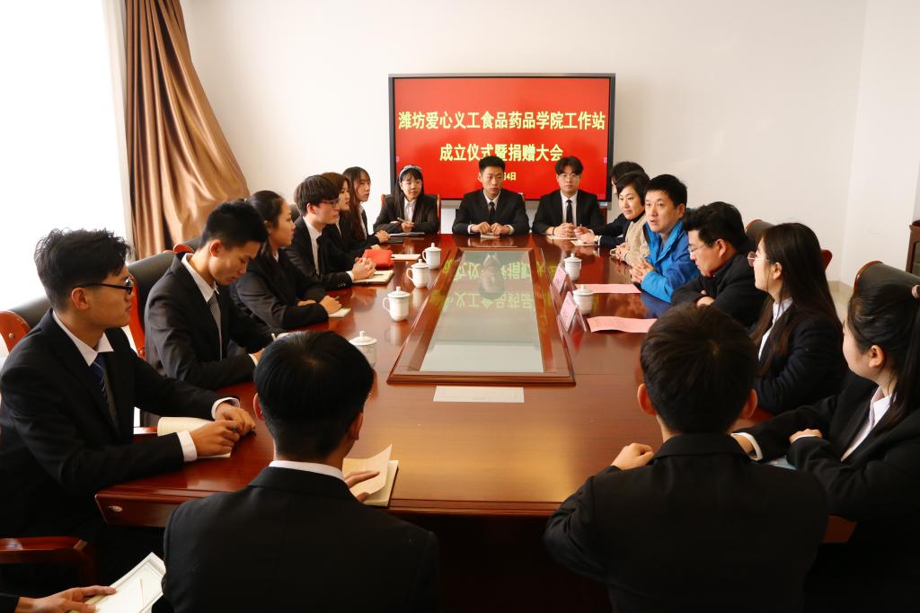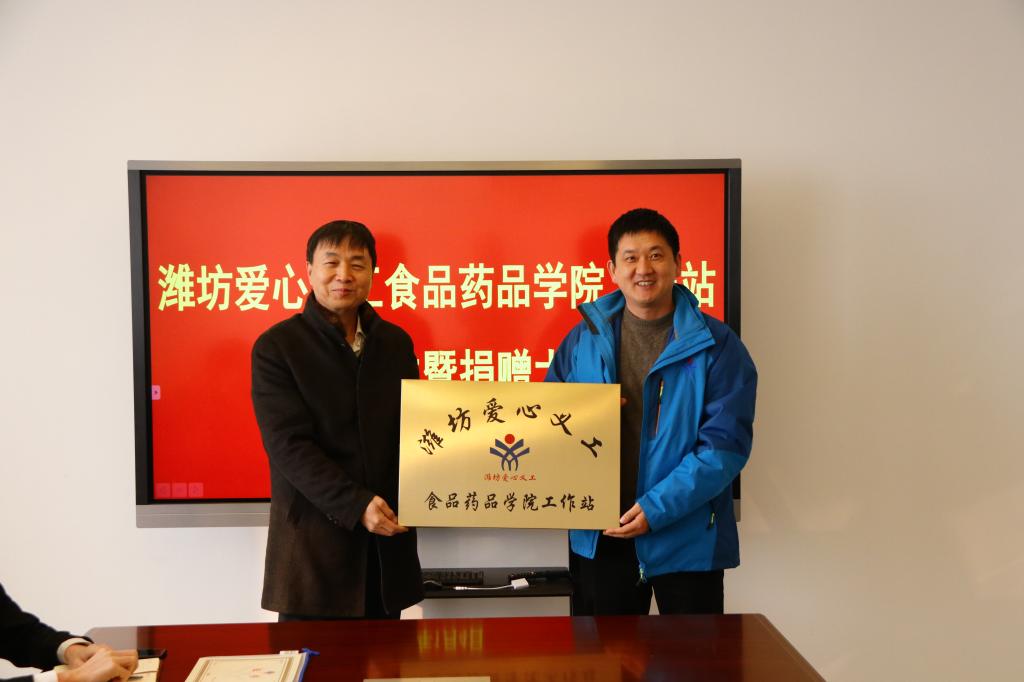 1月4日上午,潍坊义工食品药品学院工作站挂牌暨捐赠仪式在清泽楼会议室举行。潍坊市爱心义工公益服务中心理事长、党支部书记刘国栋,公益文化发展部部长张海龙、食品药品学院党支部书记、学院分管学生负责同志、学院分管教学负责同志、辅导员办公室主任(团总支书记)、大学生志愿者代表参加了仪式活动。