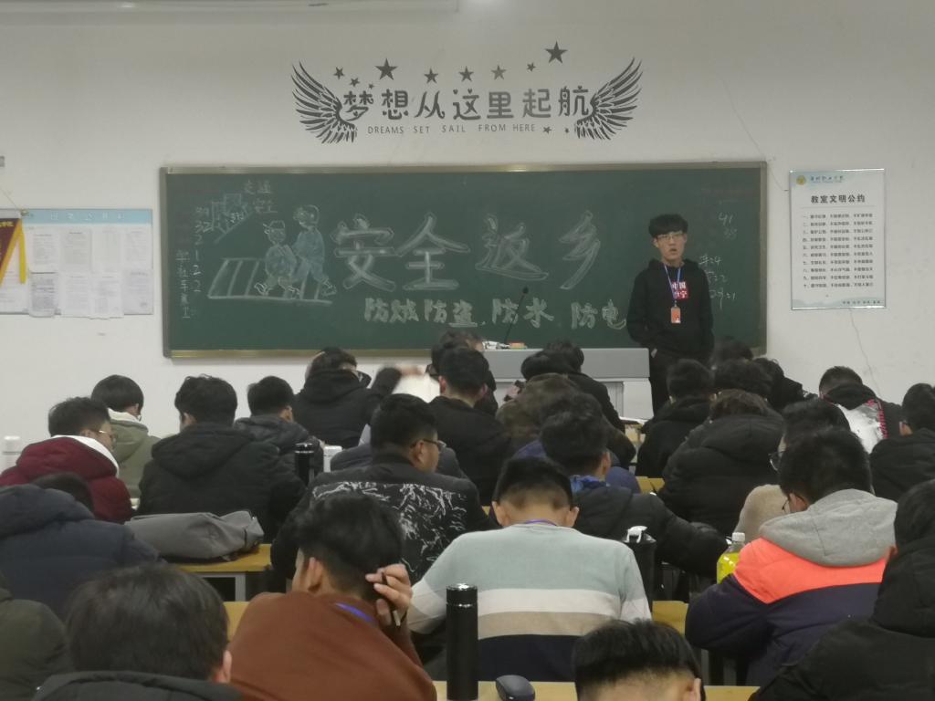 会上,各班级负责人强调了回家报平安和假期安全注意事项等。班会围绕着“大学生的出行安全、大学生生活安全、大学生意外事故安全”三大主题展开,通过事例对学生具体讲解了安全的重要性、如何防范危险、以及危险情况发生后如何正确处理等。各班级班主任辅导员要求同学们在元旦假期期间注意交通安全、饮食安全、财产安全等问题;离校期间禁止乘坐黑车和超载超员的车辆;离校前关好宿舍门窗、拔掉宿舍所有电源、随身携带或者妥善保管好贵重物品,防止盗窃、火灾等事故发生;假期期间严禁在河流、湖泊、池塘中玩耍。同时,强调同学们要切实提高警惕防范传销、诈骗团伙,防止被骗取钱财和误入传销组织。