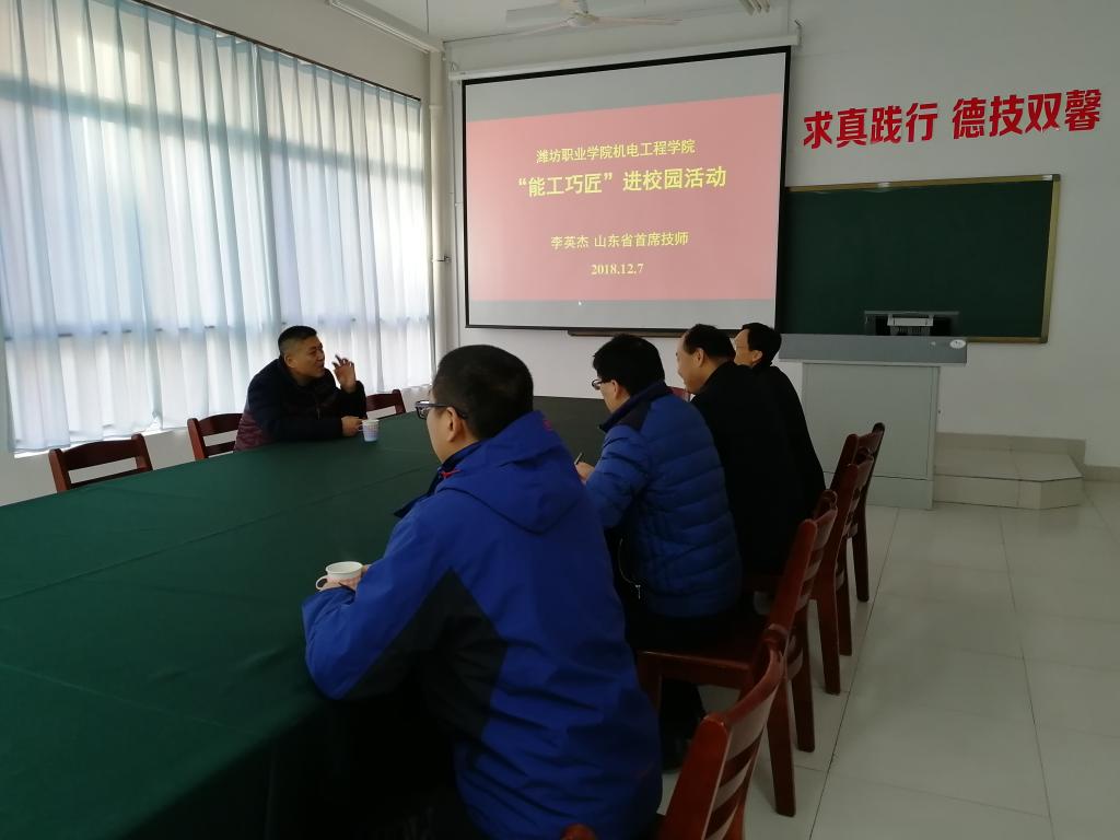 李英杰是潍柴动力的高级技师,先后被评为齐鲁首席技师、山东省机械行业首席技师、山东省有突出贡献的技师、山东省机械行业优秀科技工作者等称号。李英杰与MG冰球突破官网教师进行了座谈,以亲身经历阐释了“工匠精神”的深刻内涵,并到自动化大赛实训室、创新社团进行现场指导,他身上的踏实肯干、勇于创新、精益求精的“工匠精神”感染了被指导学生。