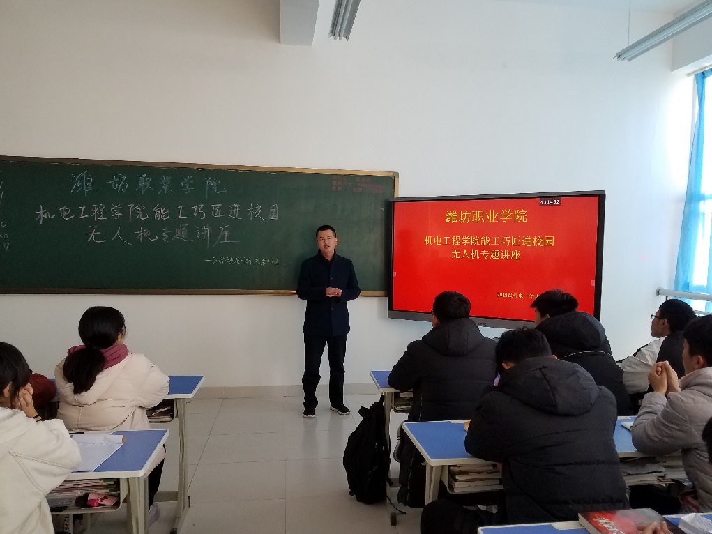 锐翔航空科技有限公司袁光刚总经理为MG冰球突破官网2018级机电一体化技术专业(无人机方向)60名同学进行了一场别开生面的无人机应用技术讲座。袁光刚用视频和实物展示的方式从无人机种类、应用场景、市场潜力、人才需求、技能掌握等方面对无人机知识进行了生动的讲解,对于正处于通识课程学习阶段的大一新生来说,袁总的讲座让在场的学生对无人机专业学习产生了浓厚的兴趣,对行业、企业、人才需求现状也有了更深的了解,对于今后的专业学习及职业生涯规划大有裨益。