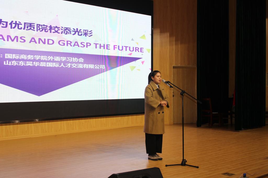 为激发广大同学学习英语的热情,加强对英语的学习,提高同学们对英语口语的兴趣,营造一个良好的英语学习氛围,国际商务学院外语学习协会于11月28日在奎文区16号楼报告厅举办以“Chase our dreams and grasp the future ”为主题的英语演讲比赛。此次活动受到山东东昊华晨国际人才交流有限公司的大力支持。