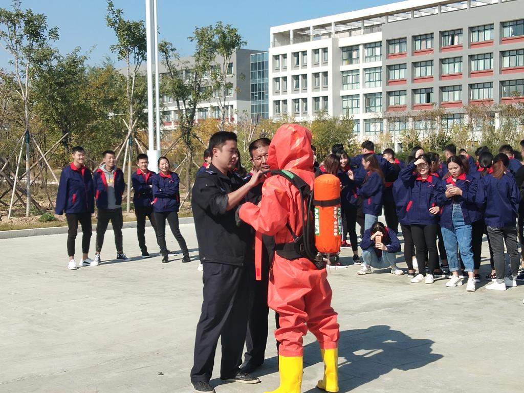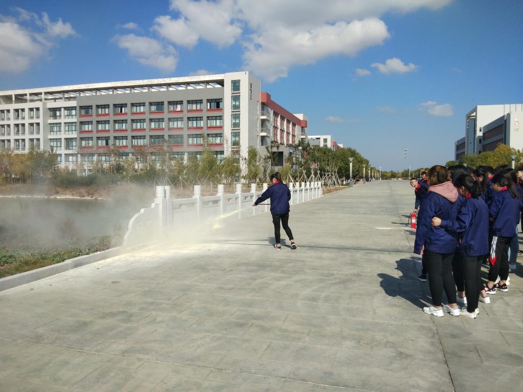 10月19日,山东国邦药业股份有限公司专职安全员王文刚和黄成勇带足授课器材,自驾单位安全防护用车,来我校为17级应用化工技术高职1班、2班进行室外防火防爆相关实践训练。授课内容重难点突出,融入“安全无小事,事事牵人心”理念,增强学生安全防范意识;授课分两个阶段,第一阶段将每班40多名学生分成两大组,分别进行消防水袋、防毒用具规范使用的讲解和练习。老师耐心讲解器材代码含义、用前检查环节、规范操作使用细节,学生逐一学习、体验,老师纠正学生操作中存在的细节性错误。第二阶段,两班合一,共同学习了干粉灭火器、二氧化碳灭火器的相关知识和防化服等企业安全装备,并挑选学生代表进行现场操作及演练。