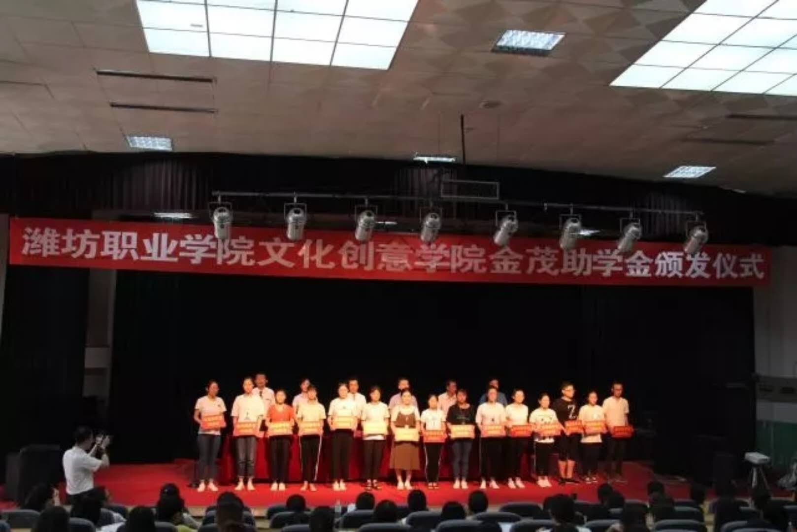 为帮助在校贫困生顺利完成学业,7月5日下午,文化创意学院“金茂奖助学金”颁发仪式在16号楼报告厅顺利举行。潍坊金茂国际大酒店宋宏杰先生等一行3人,文化创意学院相关负责同志,辅导员和学生代表参加了本次颁发仪式。