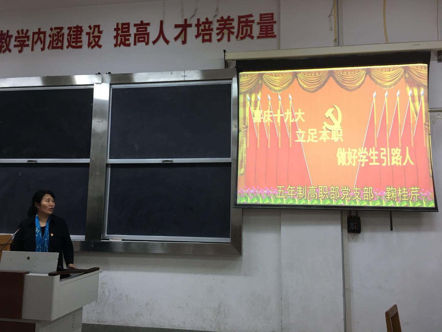 10月19日下午,五年制高职部负责同志在9号楼202室为部门全体教职工上了一堂题为“喜庆十九大,立足本职,做好学生的引路人”的党课。