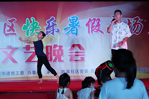 此次演出是大虞街道党工委办事处主办,陈家社区党委承办的“陈家社区快乐暑假专场”文艺晚会,参与演出的演员有国际商务学院“与梦同翔”团队的学生以及一些中小学生和幼儿园的小朋友,观众是陈家社区以及周围社区的老百姓。虽然当晚天气炎热,但是观众看节目的热情不减,演员们表演的情绪也高涨。晚会以动感十足、节奏鲜明的非洲鼓热辣开场,并穿插各种风格的歌曲、舞蹈、乐器演奏等节目,异彩纷呈,精彩不断。一曲《我的歌声里》,嗓音优美、情感充沛,赢得了观众的此起披伏的欢呼;歌伴舞《南山南》,有情怀、有韵味,博得了台下观众阵阵掌声。