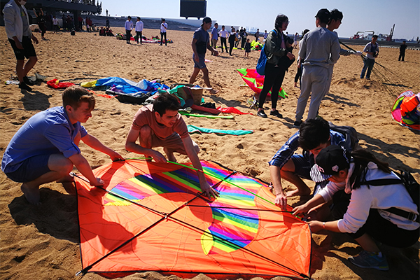 潍坊国际风筝节享誉海内外,留学生来到潍坊最大的心愿之一就是体验一下风筝制作与放飞。学生们在课堂上学习了风筝绘制文化课,这次随《奥列弗游中国》潍坊拍摄机会,组织留学生们走出课堂,亲身感受大海边放风筝过程。在滨海放飞场,学生们集体动手将风筝插制起来,将缤纷多彩的风筝放飞向高空。返回途中,学生们兴奋地跟老师交流放飞中看到的人文景观。