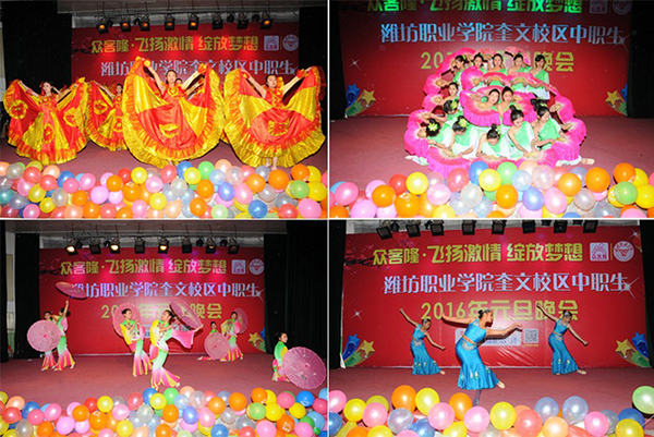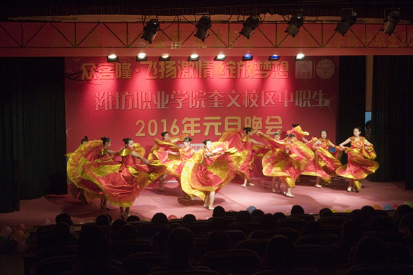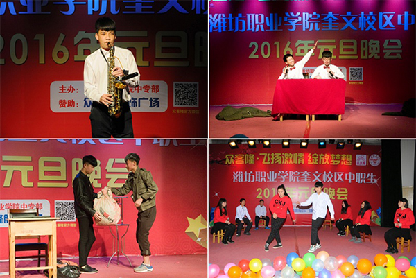 12月29日,由中专部举行的中职生“飞扬激情,绽放梦想”2016年元旦晚会在奎文校区16号楼报告厅举行。学院副院长贺志强以及各部门各二级学院负责同志与奎文校区中职师生观看了晚会。