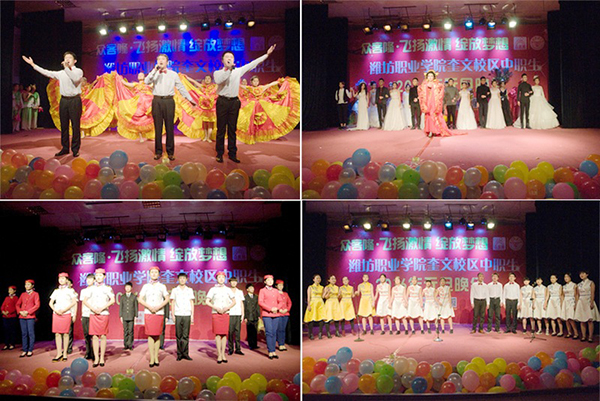 热情欢快、轻盈优美的舞蹈《踏歌起舞》拉开了晚会的帷幕,曼妙的舞步和动感的舞曲,瞬间点燃全场的热情。由中专部师生共同表演的英文歌曲《雪绒花》,表达了对生活的无限向往和对祖国热爱。《礼仪表演》和《彩妆秀》充分展示了中职技能教学所取得的丰硕成果。“北国风光,千里冰封,万里雪飘……”配乐诗朗诵《毛泽东诗词》,让我们感受到一代伟人,磅礴的气势和广阔的胸怀。相声《搞笑新闻联播》诙谐幽默,舞蹈《雨中花》、《茉莉花》充满了民族特色。