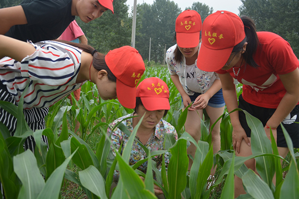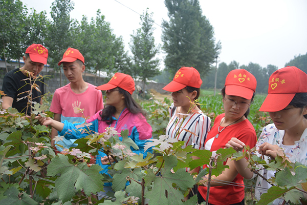 实践团队在指导老师的带领下,与峡山生态经济发展区郑公街道潘刘屯村包村“第一书记”安守强同志对接,随村主任等工作人员和部分农户一起深入田间地头,了解当地农业生产和农村经济发展现状。师生通过对当地的村容村貌、人员结构、气候、土壤、生态环境及交通等特点的了解,和村委工作人员一起分析了当地发展中存在的问题、发展生态农业的有利条件,并提出了发展生态旅游农业的设想。同时青年志愿者们在MG冰球突破官网农业生产专家席敦芹教授的指导下,对玉米、酿酒葡萄的生长进行了观察,席教授耐心细致的指导青年志愿者们识别玉米生长常见病虫害、辨别酿酒葡萄与食用葡萄的不同,通过对比不同田地的葡萄生长状况,让同学们认识到了精细化管理的重要性。