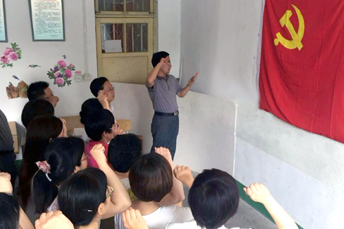 全体党员同志面对鲜艳的党旗,举起右拳,重温入党誓词。党员们对照“三严三实”的标准,细致查找自己在思想上、学习上、工作中、生活中的问题和不足,深入开展批评和自我批评。